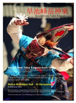 以下の日程により、岩手県の早池峰岳神楽のワークショップ及び公演、並びにバリ・バロンダンスとのコラボレーション公演が開催されます。これは、日本の「岳神楽を応援する会」が主催し、在デンパサール日本国総領事館(在外公館文化事業)及びインドネシア国立芸術大学(ISI)デンパサール校が共催となって開催されるものです。